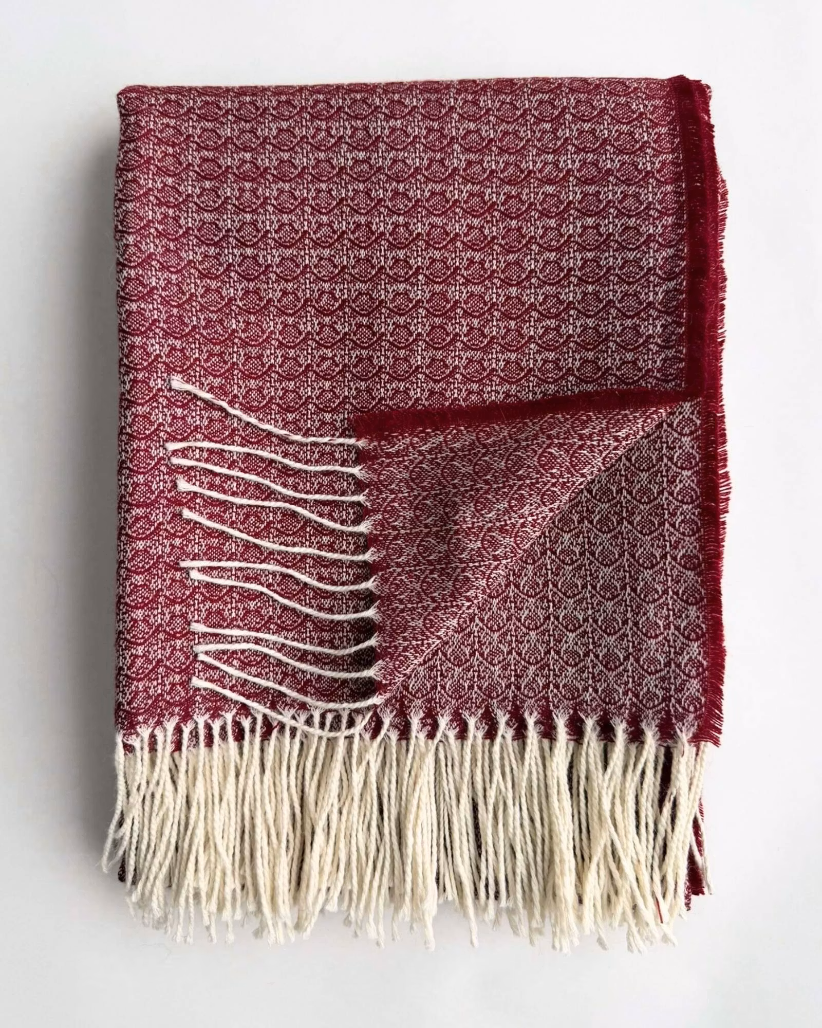 NINA betyder eld men uttrycket är stilla snarare än dramatiskt. Den djupa rödtonen möter ett mjukt naturfärgat inslag i det vävda mönstret och skapar en levande yta med diskret struktur.