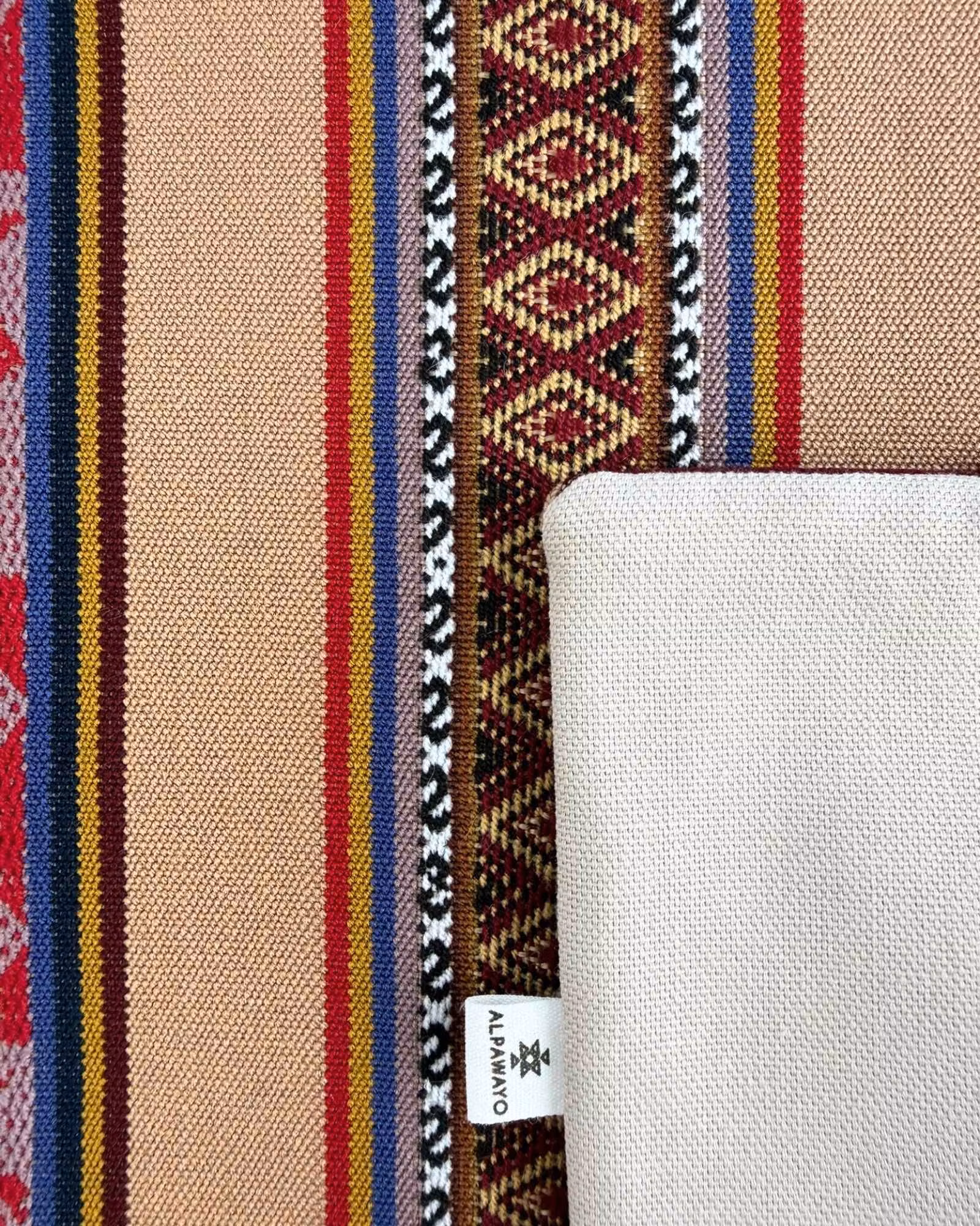 Den beige basen möts av vinröda och blå vävda mönster, kombinerat med jordnära toner och klassiska andinska symboler.