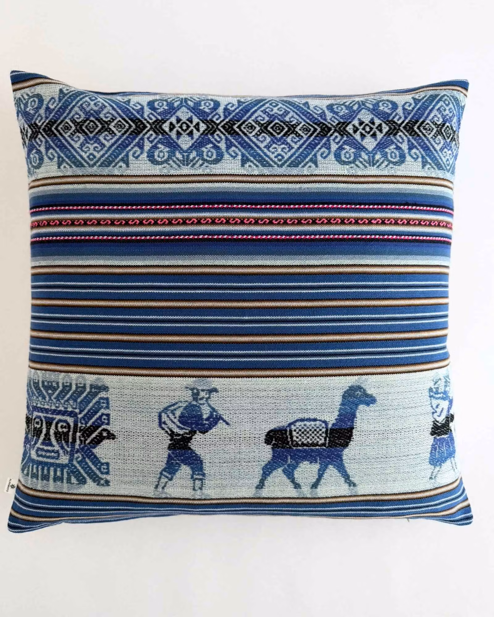Den blå basen möter detaljer av beige, svart och rosa, med vävda figurer inspirerade av liv och tradition i Anderna. Ett kuddfodral som tillför ro, harmoni och karaktär i soffan, sovrummet eller läshörnan.