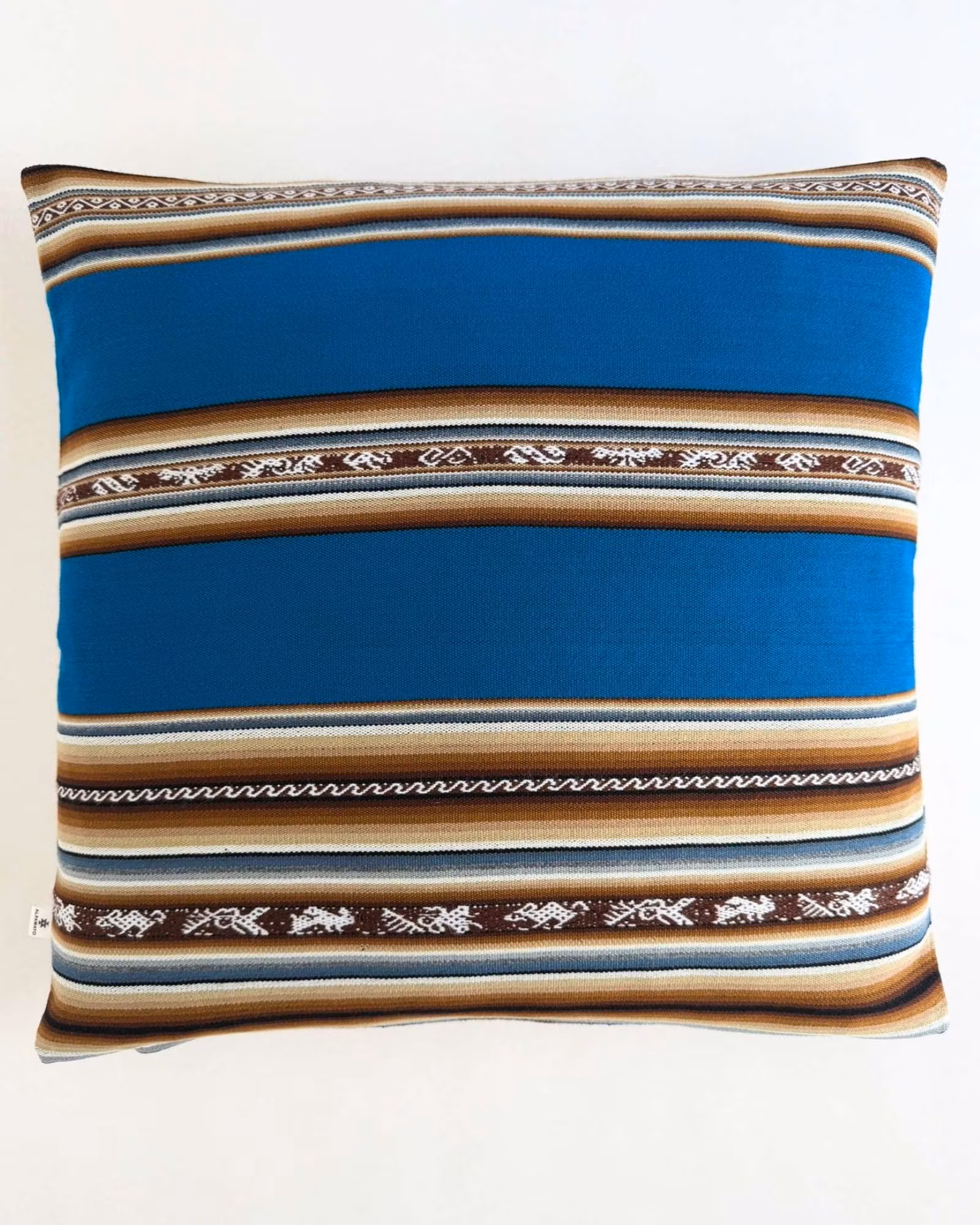 Handgjort kuddfodral i blåbrun aguayo 50×50 – unik andinsk textil sydd i Sverige. Harmonisk, levande och personlig design. Skickas varsamt inom några dagar.