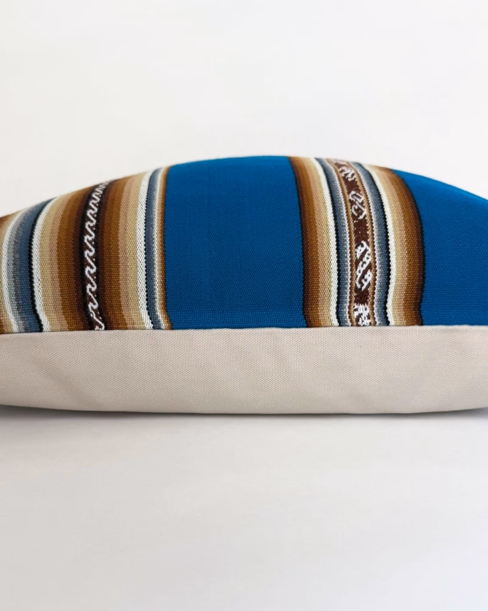 Den klara blå basen möts av vävda mönster i beige, brunt och naturvita toner. Kombinationen ger ett lugnt men uttrycksfullt intryck där färgen påminner om klar himmel och höga vidder. Variation i mönsterplacering gör varje kuddfodral unikt – inget exemplar är det andra helt likt.